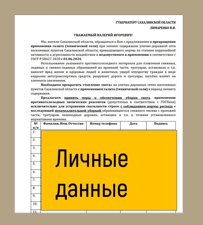 Открытое обращение жителей Сахалинской области по вопросу зимнего содержания дорог в адрес губернатора Сахалинской области Валерия Лимаренко было направлено 7 октября 2025 года.