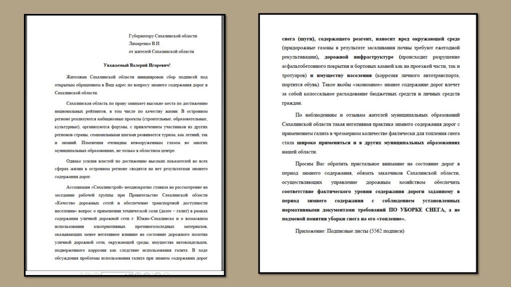 Более 5, 5 тысяч сахалинцев подписали открытое обращение к губернатору Валерию Лимаренко. Жители области обеспокоены чрезмерным применением в зимний период технической соли (галита) на улицах городов и поселков. Ассоциация «Сахалинстрой» поддерживает позицию инициативной группы и продолжает информировать региональные органы исполнительной власти о недопустимости нарушения технологии снегоуборочных работ, предусмотренной нормативными правовыми актами. Несоблюдение нормы расхода технической соли (галита) негативно влияет на состояние автомобилей (коррозия металла) и улично-дорожной сети населенных пунктов, на восстановление которой требуются дополнительные бюджетные средства.