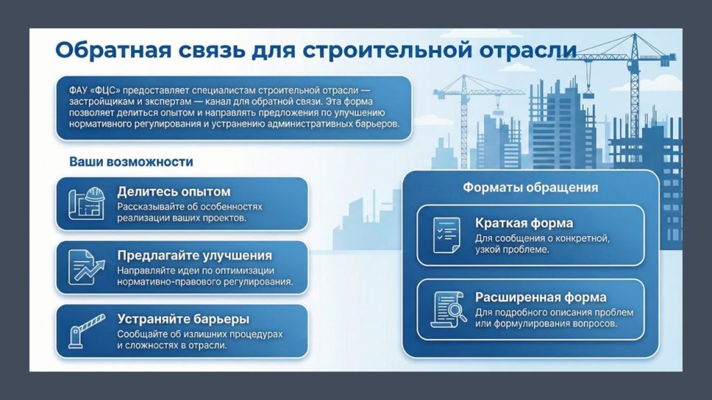 Застройщики и иные специалисты в области строительства могут направить свои замечания и предложения по оптимизации нормативного правового регулирования отдельных процедур при реализации проектов ОКС.