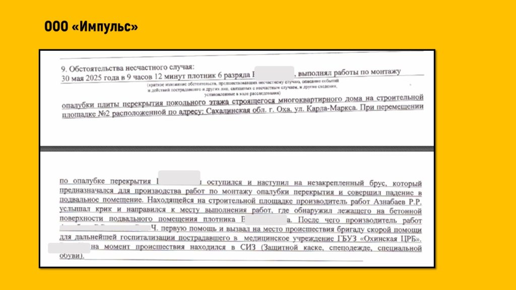 Тяжелый несчастный случай при строительстве многоквартирного жилого дома (подрядчик ООО «Импульс») произошел в мае текущего года в городе Оха. Работник упал с 1 этажа в подвальное помещение и получил повреждение позвоночника.