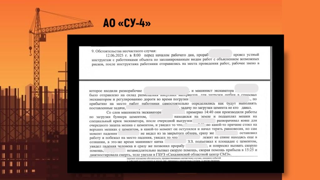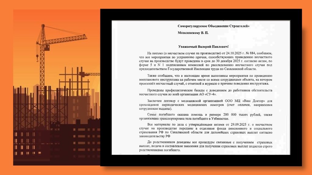 Представители АО «СУ-4» проинформировали, какие действия уже совершила организация, чтобы в дальнейшем не допустить несчастных случаев на производстве, о финансовых выплатах родственникам погибшего и об обеспечении возможности получения ими страховых выплат из Социального фонда РФ.