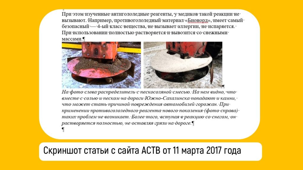 Представитель бизнеса — директор ООО «Сахснабсервис» Виктор Блинов «огорошил» участников заседания неожиданной информацией. Как оказалось ООО «Сахснабсервис» в течение 10-ти лет является официальным дилером Уральского завода противогололедных материалов в Сахалинской области. И в 2017 году в качестве эксперимента проспект Мира в Южно-Сахалинске 4 месяца обрабатывали «Бионордом». Материал тогда доказал свою эффективность.