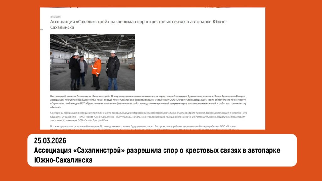 Контрольный комитет Ассоциации «Сахалинстрой» 20 марта провел выездное совещание на строительной площадке будущего автопарка в Южно-Сахалинске. В адрес Ассоциации поступило обращение МКУ «УКС» города Южно-Сахалинска о ненадлежащем исполнении ООО «Остов» (член Ассоциации) своих обязательств по контракту «Строительство базы для МУП «Транспортная компания» (выполнение работ по подготовке проектной документации, инженерных изысканий и работ по строительству объекта).