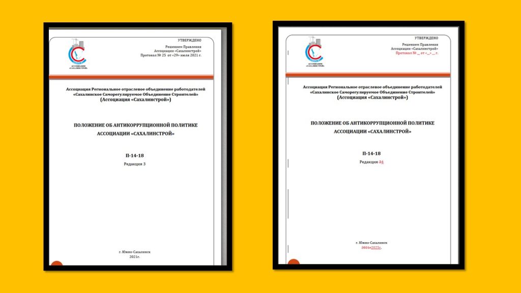 В настоящее время Правлением Ассоциации (02.12.2025) согласовано проведение процедурных мероприятий по внесению изменений и утверждению новой редакции проекта внутреннего документа Ассоциации «Положение об антикоррупционной политике Ассоциации «Сахалинстрой» (П-14)».