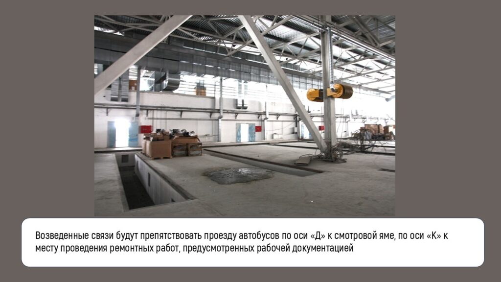 Суть спора следующая. Подрядчик» в Производственном здании установил крестовые связи СВ-5 по оси «Д» и «К» в осях «9» — «11», предусмотренные рабочей документацией. Но возведенные связи будут препятствовать проезду автобусов по оси «Д» к смотровой яме, по оси «К» к месту проведения ремонтных работ, предусмотренных рабочей документацией.
