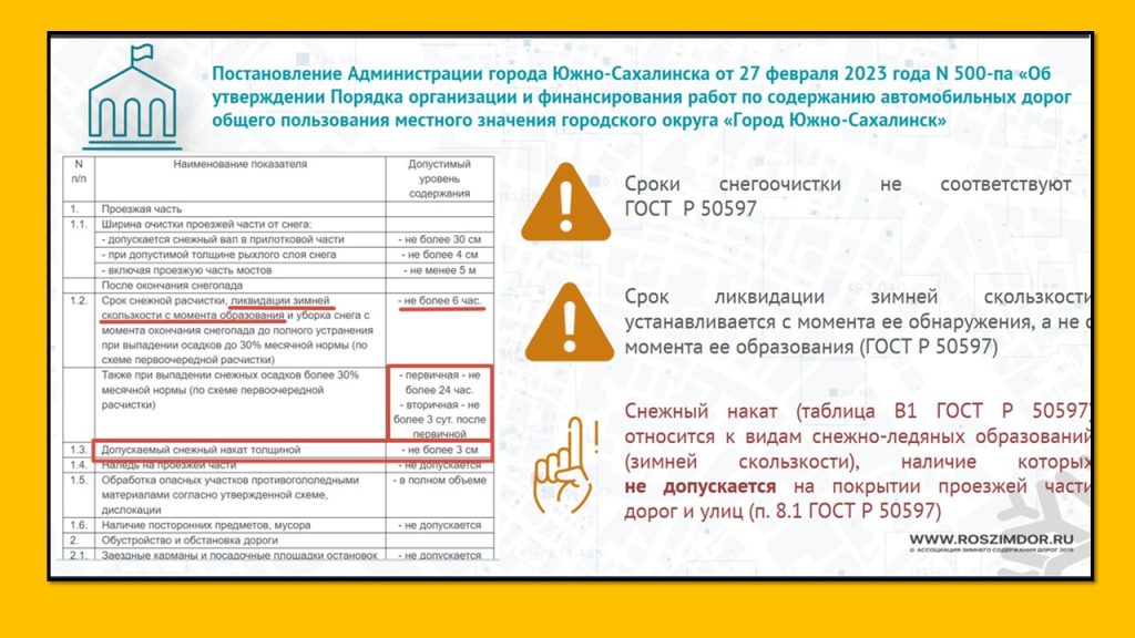 Например, в Постановлении Администрации города Южно-Сахалинска от 27 февраля 2023 года №500-па «Об утверждении Порядка организации и финансирования работ по содержанию автомобильных дорог…» сроки снегоочистки не соответствуют ГОСТу Р 50597 — 2017. Поэтому региональный документ необходимо привести в соответствие федеральному нормативному акту.