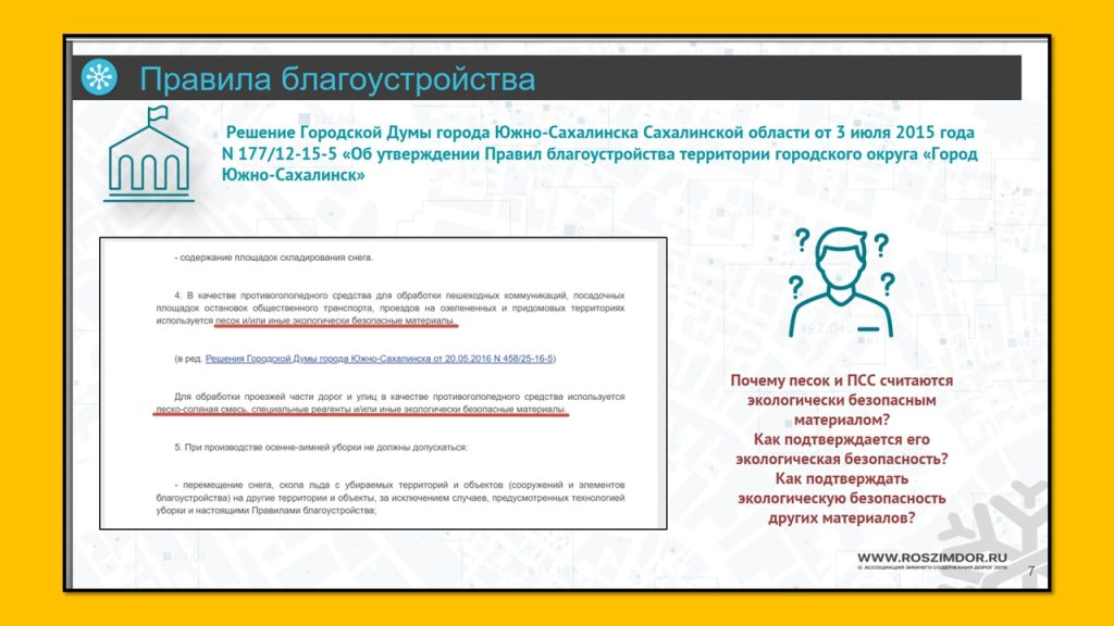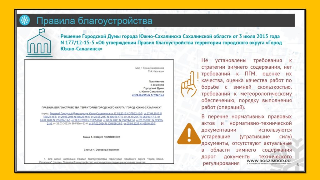 Также Павел Криушин озвучил недочеты в разделах, связанных по организации работ по зимнему содержанию дорог, в документах Городской Думы Южно-Сахалинска. В частности, большое количество ссылок на документы, которые утратили свою силу и отменены. Поэтому в финале доклада эксперт предложил: